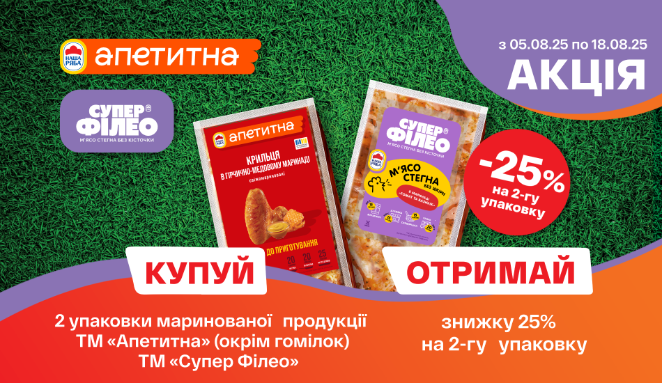 З 5 по 18 серпня отримуйте -25% знижки на другу упаковку маринованої курки «Супер Філео» та «Апетитна» (окрім гомілок).