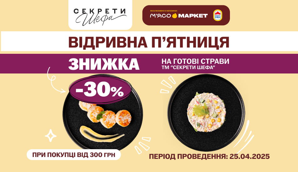 Завітайте до нас в магазини М’ясомаркет, «Наша Ряба», «Їжа свіжа», «Українське Курча» 25 квітня та купуйте смачну кулінарію «Секрети Шефа» зі знижкою – 30%.