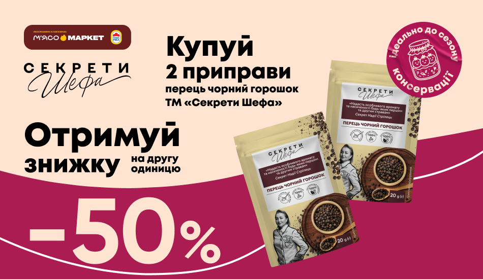 Не проґавте можливість придбати приправи «Секрети Шефа» зі знижкою до сезону консервації. Купуйте 2 перці горошком і отримуйте -50% на другу одиницю.