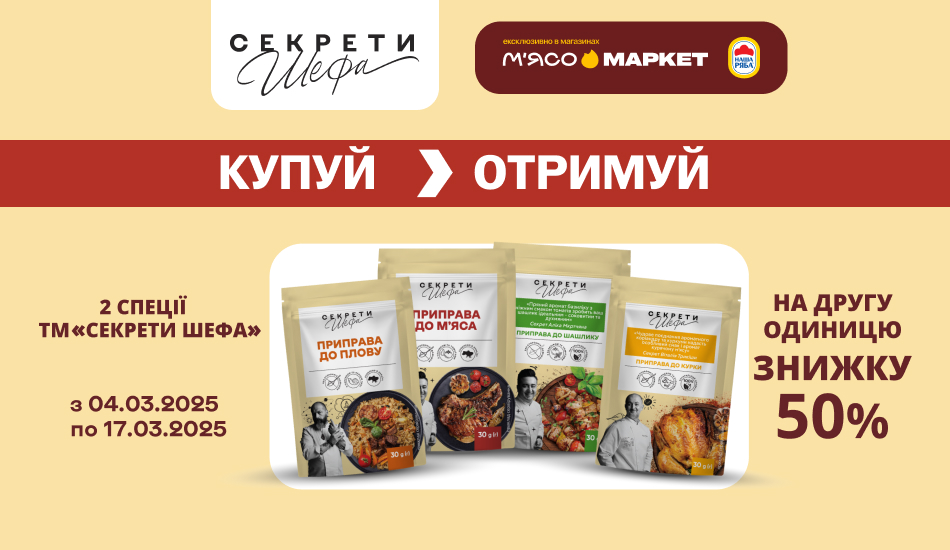 Не проґавте можливість придбати ексклюзивні спеції від шефів «Секрети Шефа» зі знижкою. Купуйте приправи до м’яса, до плову, до курки, до шашлику «Секрети Шефа» і отримуйте -50% на другу одиницю.