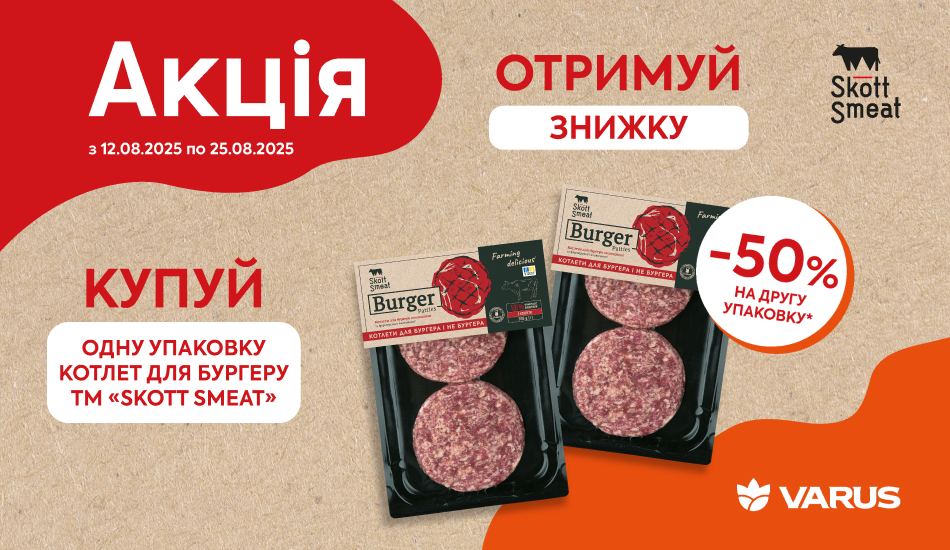 З 12.08.2025 по 25.08.2025 купуйте одну упаковку котлет для бургера та отримуйте – 50% знижки на другу упаковку.