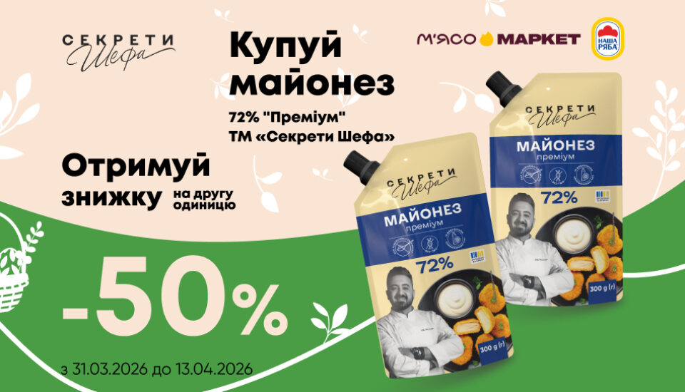 Купуйте майонез «Преміум» 72% (300 г) від «Секрети Шефа» і отримуйте знижку -50% на другу упаковку. Готуйте ще більше улюблених страв!