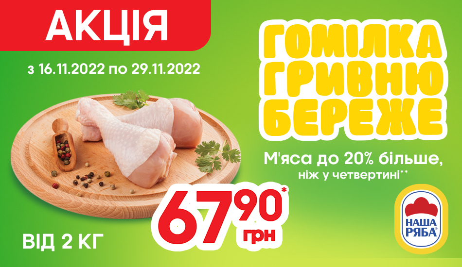 За умови придбання від 2 кг гомілок курячих охолоджених з карткою програми лояльності «ЇМО» ціна 1 кг гомілок курячих охолоджених становить 67,90 грн. Пропозиція діє за наявності акційної продукції.