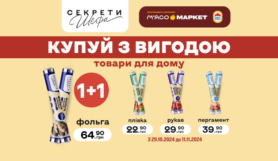 На кухні все знадобиться: пергамент для запікання, рукав, фольга або харчова плівка. Купуйте відразу 2 (одного найменування), а платіть лише за один товар!