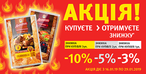 У період з 16.01.2019 по 29.01.2019 (включно) КУПУЙТЕ будь-які упаковки продукції ТМ «Наша Ряба Апетитна» в ТЦ мережі «Метро» та ОТРИМУЙТЕ ЗНИЖКУ: