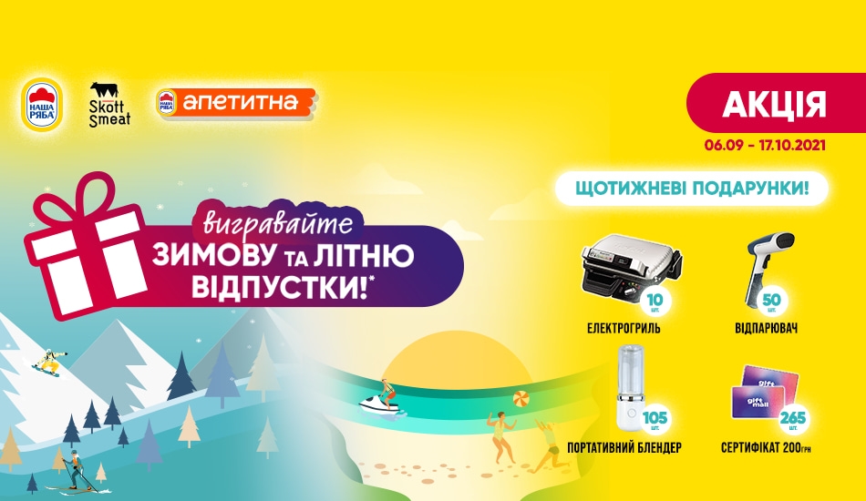 – Зареєструйте мінімум 5 кодів та беріть участь у розіграші ГОЛОВНОГО подарунку – СЕРТИФІКАТУ на зимову та літню відпустки (вартість подорожі до 100 000грн)