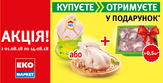 У період з 01.08.2018 по 14.08.2018 (включно) КУПУЙТЕ Тушку фасовану або нефасовану ТМ «Наша Ряба» в мережі магазинів «Еко-маркет» та ОТРИМУЙТЕ Шлунок курячий ТМ «Наша Ряба» у вакуумній упаковці 0,5 кг у ПОДАРУНОК*