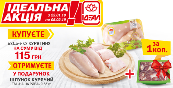 ТМ «Наша Ряба» або нефасовану продукцію (постачальника ПрАТ «МХП») від 115 грн.* в мережі магазинів «Ідеал» та ОТРИМУЙТЕ 1 упаковку шлунку курячого ТМ «Наша Ряба» у вакуумній упаковці 0,65 кг за 0,01 грн. у ПОДАРУНОК**