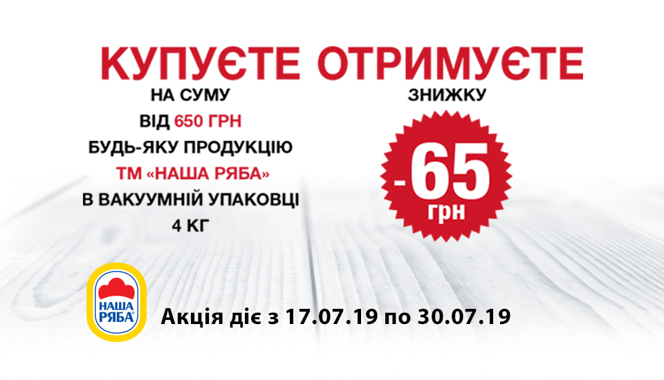 У період з 17.07.2019 по 30.07.2019 (включно) КУПУЙТЕ будь-яку продукцію ТМ «Наша Ряба» в груповій вакуумній упаковці 4 кг на суму від 650 грн., та ОТРИМУЙТЕ знижку в розмірі 65 грн.