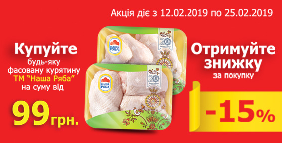 У період з 12.02.2019 по 25.02.2019 (включно) КУПУЙТЕ будь-яку фасовану продукцію ТМ «Наша Ряба» на суму від 99 грн. в мережі магазинів «Новус» та ОТРИМУЙТЕ знижку -15% на здійсненну покупку*