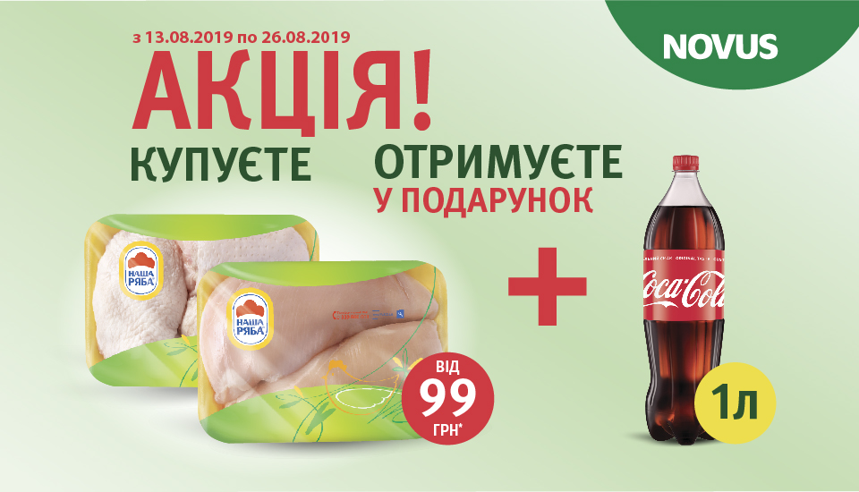 У період з 13.08.2019 по 26.08.2019 (включно) КУПУЙТЕ будь-яку фасовану продукцію ТМ «Наша Ряба» або продукцію ТМ «Наша Ряба Апетитна» в мережі магазинів «Novus» від 99 грн. та ОТРИМУЙТЕ одну пляшку безалкогольного напою ТМ «Coca-Cola», 1л. у ПОДАРУНОК*