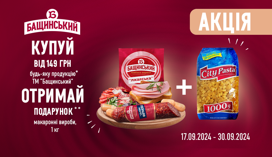 Тож мерщій в магазини «М’ясомаркет», «Наша Ряба» або «Українське курча»: купуйте продукцію бренду «Бащинський» від 149 грн та отримуйте в подарунок макарони ТМ City Pasta.