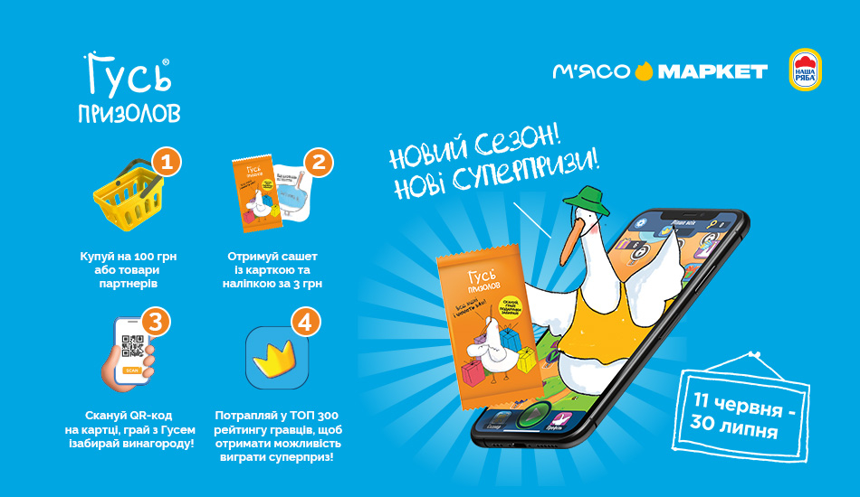 отримай можливість купити сашет «Гусь Призолов» за акційною ціною 3 гр​н (звичайна ціна сашету – 10 грн). Всередині кожного сашета знаходиться картка та наліпка з Гусем. А на звороті кожної картки — унікальний QR-код, який відкриває ігрові подарунки у грі.