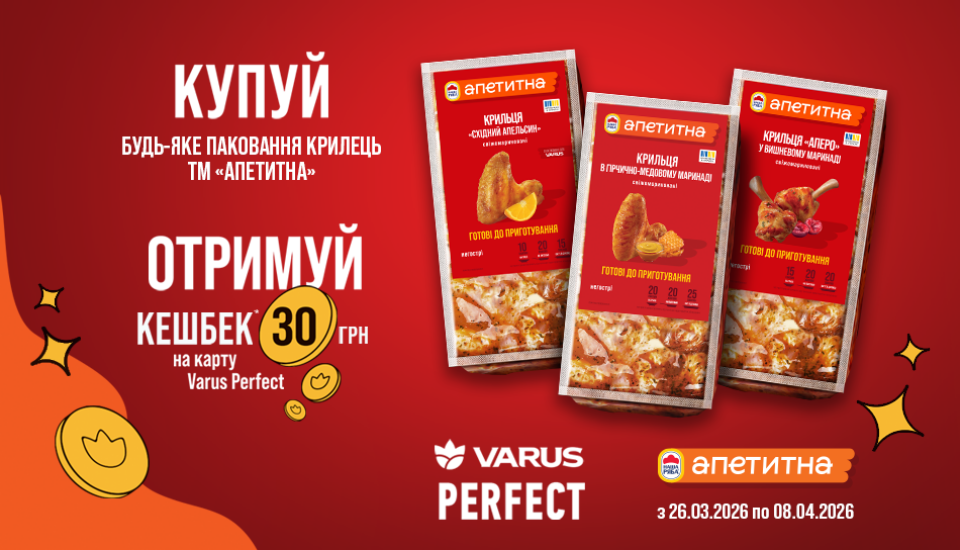 З 26.03.2026 по 08.04.2026 купуйте будь-яке пакованння маринованих крилець ТМ «Апетитна» та отримуйте 30 грн кешбеку.