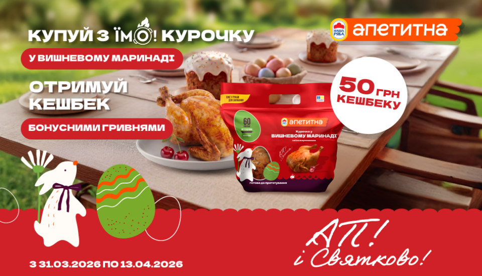 Купуйте Курочку у вишневому маринаді від «Апетитна» й отримуйте кешбек 50 грн кешбеку на картку програми лояльності «ЇМО!».