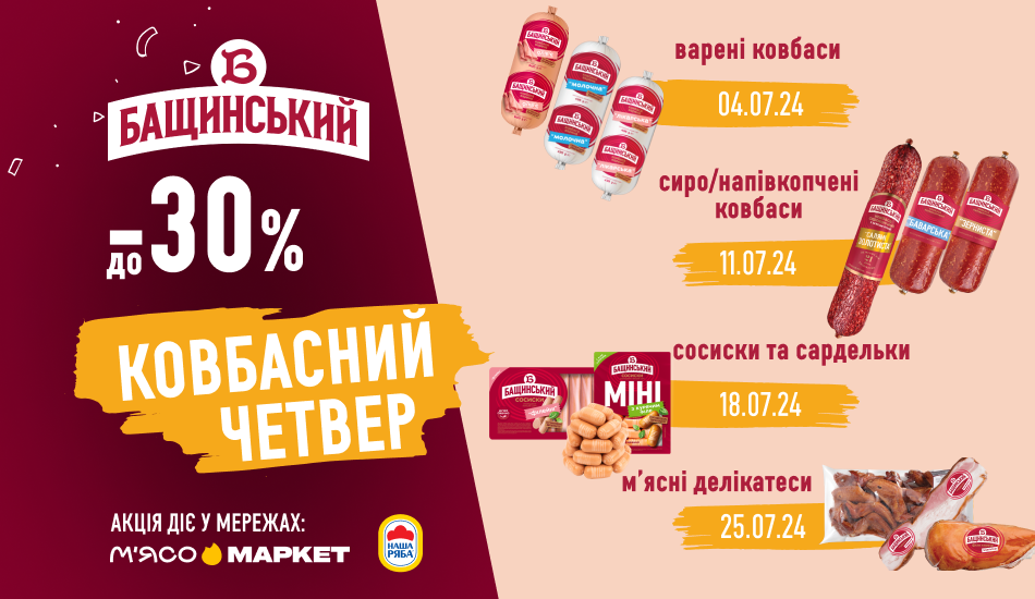 Щочетверга у магазинах М’ясомаркет, Наша Ряба, Їжа свіжа, Українське курча знижки до -30% на смачненькі ковбаси, сосиски та м’ясні делікатеси від «Бащинський».