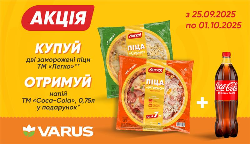 З 25.09. по 01.10.2025 купуй піцу ТМ «Легко» – отримуй напій «Coca Cola» 0,75 л у подарунок.