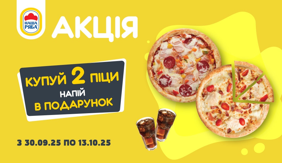 Купуйте дві будь-які піци в мережі магазинів М’ясомаркет, «Наша Ряба», «Їжа Свіжа», «Українське курча» та отримуйте Pepsi 1 л або Coca-Cola 1 л у подарунок.