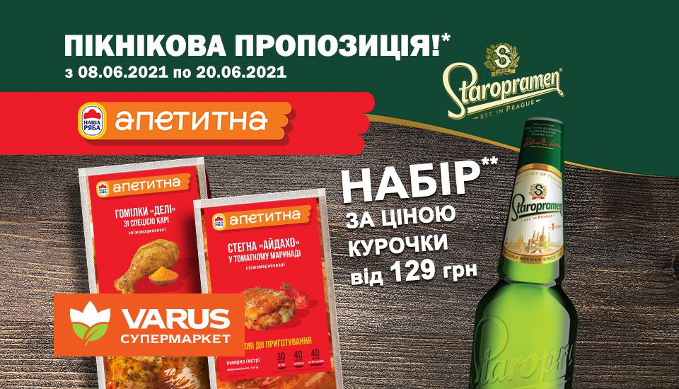 У період з 08.06.2021 по 20.06.2021 (включно) НАБІР** з будь-якої продукції ТМ «НР Апетитна» на суму від 129 грн та 1 пляшки пива ТМ «Staropramen» світле 1л за ціною курочки