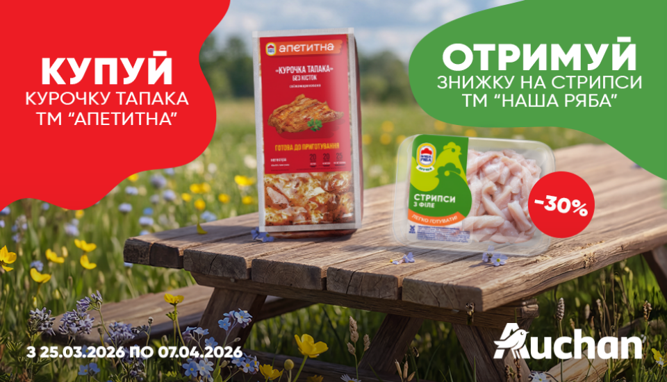 З 25.03.26 по 07.04.26 купуйте курочку «Тапака» ТМ Апетитна – отримуйте знижку -30% на курячі стрипси ТМ Наша Ряба.