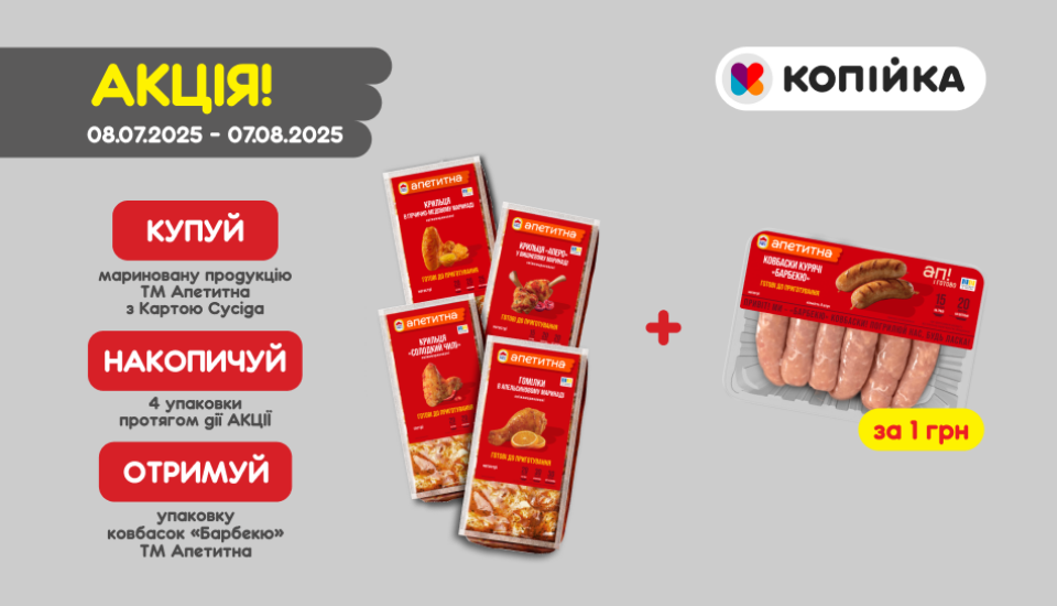 З 8 липня по 7 серпня купуйте від 4-упаковок будь-якої маринованої продукції «Апетитна» з картою програми лояльності «Хороші сусіди» – отримуйте упаковку ковбасок Барбекю всього за 1 грн!