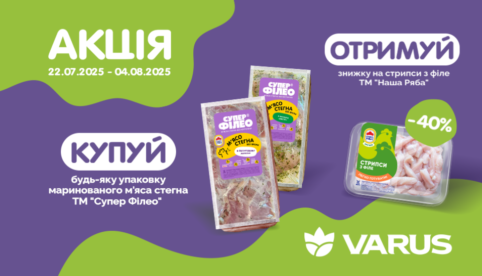 З 22.07.25 по 04.08.25 купуй будь-яку упаковку маринованого м’яса ТМ «Супер Філео» – отримуй знижку 40% на стрипси курячі ТМ «Наша Ряба».
