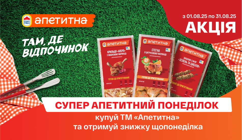 Ви бажали – ми здійснили! Щопонеділка ловіть знижку до 35% на продукцію «Апетитна». Крильця, ковбаски, гомілки, стегна, шашлик – довго не думайте, а купляйте за вигідною ціною!