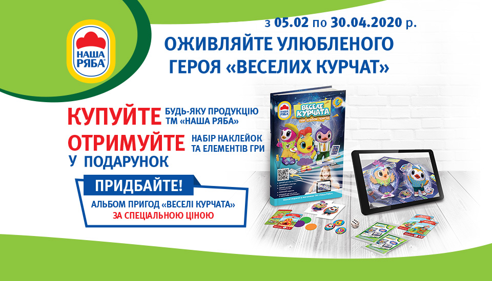 У період з 05.02.2020 по 30.04.2020 р. (включно) КУПУЙТЕ будь-яку продукцію ТМ «Наша Ряба», ТМ «Наша Ряба Апетитна», ТМ «Секрети Шефа» у фірмових магазинах ТМ «Наша Ряба» на суму від: 150грн. — гарантовано отримайте в подарунок «один набір з наклейками та елементами гри».