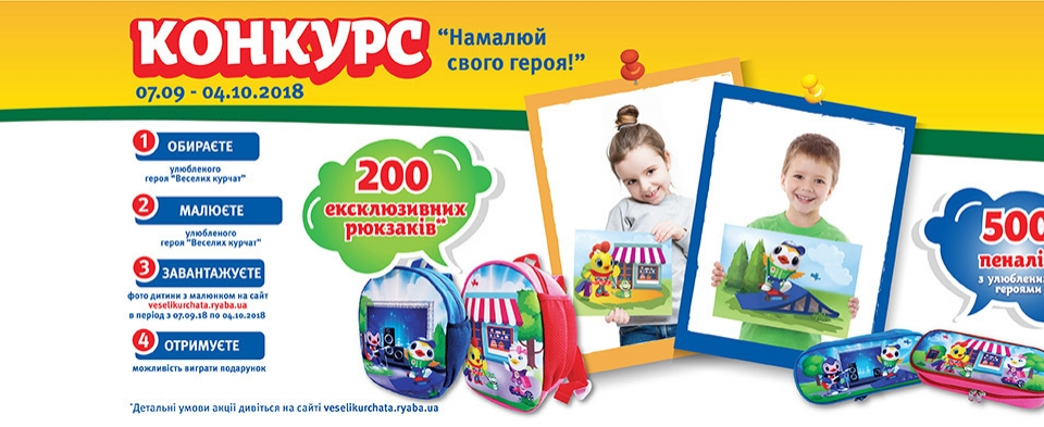 героїв «Веселих курчат», згідно рішення експертної команди організатора конкурсу, отримають у подарунок рюкзак з улюбленими героями**.