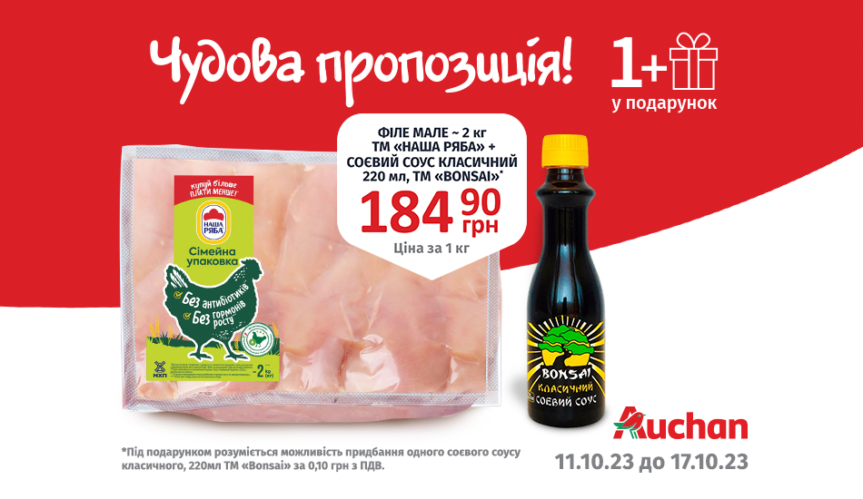 В період з 11.10.2023 по 17.10.2023 (включно) КУПУЙТЕ акційну продукцію Філе мале ~2 кг ТМ «Наша Ряба» та отримуйте соєвий соус BONSAI 220 мл за 0,10 грн з ПДВ, за умови наявності в асортименті магазинів мережі «АШАН».