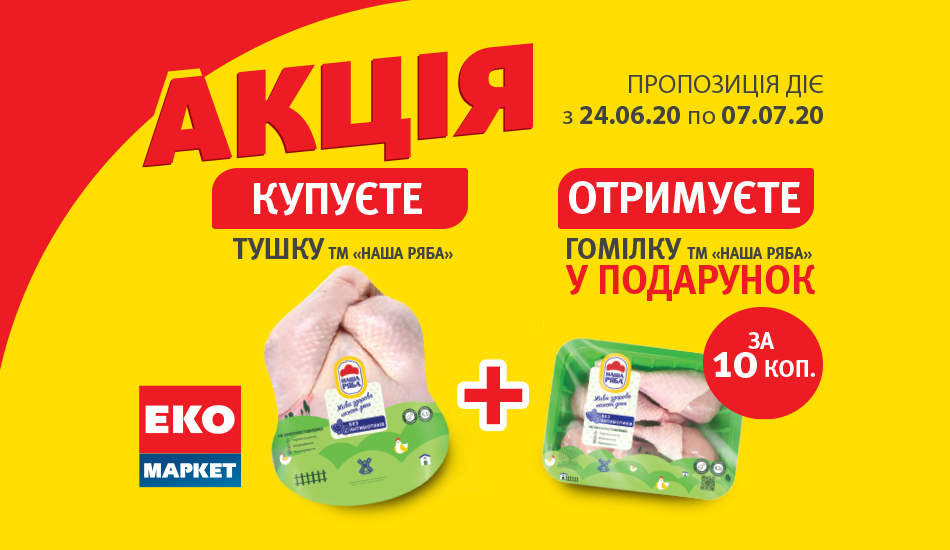 У період з 24.06.2020 по 07.07.2020 (включно) КУПУЙТЕ Тушку фасовану ТМ «Наша Ряба» в мережі магазинів «Еко-маркет» та ОТРИМУЙТЕ Гомілку курячу у малій упаковці PET лоток ТМ «Наша Ряба» у ПОДАРУНОК*