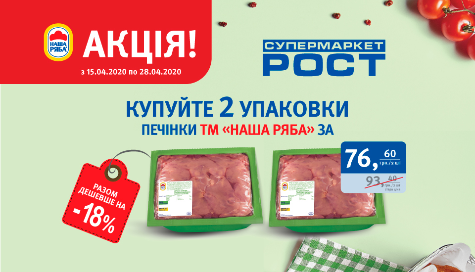 У період з 15.04.2020 по 28.04.2020 (включно) КУПУЙТЕ 2 упаковки Печінки курячої ТМ “Наша Ряба” у вакуумній упаковці 0,65 кг за 76,60 грн. Економія -18%*