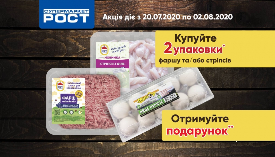 У період з 20.07.2020 по 02.08.2020 (включно) КУПУЙТЕ 2 упаковки Фаршу «Філейного» та/або Стріпсів з філе ТМ «Наша Ряба» на вибір, в мережі магазинів «Рост» та ОТРИМУЙТЕ 1 лоток яєць ТМ «Минор» 10 шт. у ПОДАРУНОК*