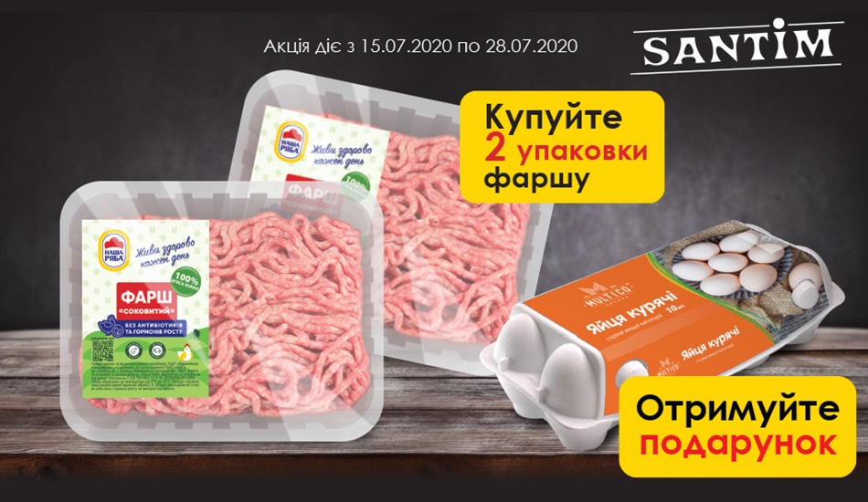 У період з 15.07.2020 по 28.07.2020 (включно) КУПУЙТЕ 2 упаковки Фаршу «Соковитий» ТМ «Наша Ряба» в мережі магазинів «Santim» та ОТРИМУЙТЕ 1 лоток яєць ТМ «Multico» 10 шт. у ПОДАРУНОК*