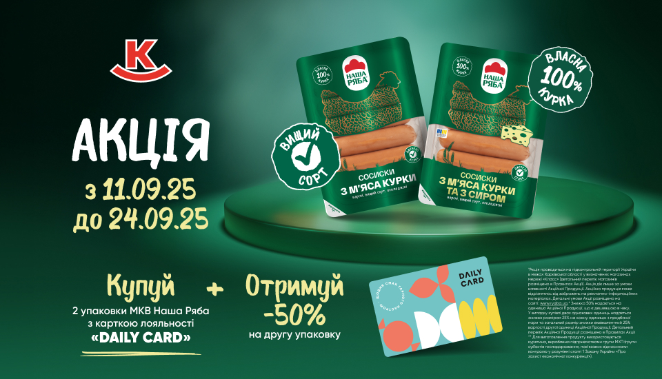 З 11 по 24 вересня отримуйте -50% знижки на другу упаковку сосисок «Наша Ряба» при покупці двох упаковок з карткою лояльності Daily Card.