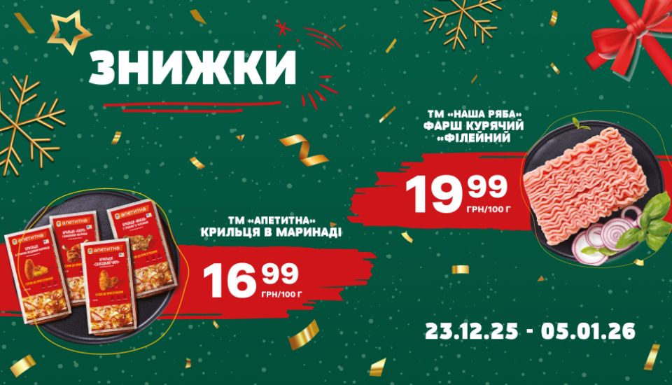 З 23 грудня по 5 січня на фарш «Філейний» «Наша Ряба», крильця в маринаді «Апетитна» («Аперо», «Макао», в гірчично-медовому маринаді, «Солодкий чилі»), курча «Аджика» та «Трави та цибуля» «Курка по-домашньому» діє акційна ціна.