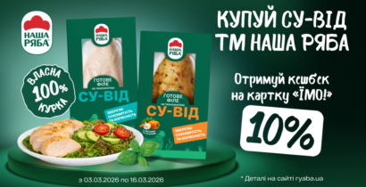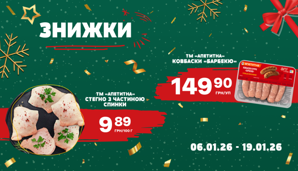 З 6 по 19 січня на cтегно з частиною спинки «Наша Ряба» та ковбаски курячі Барбекю «Апетитна» діє акційна ціна.