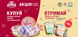 -30% на кукурудзу чи горошок ТМ Секрети Шефа при купівлі вареної ковбаси ТМ Бащинський