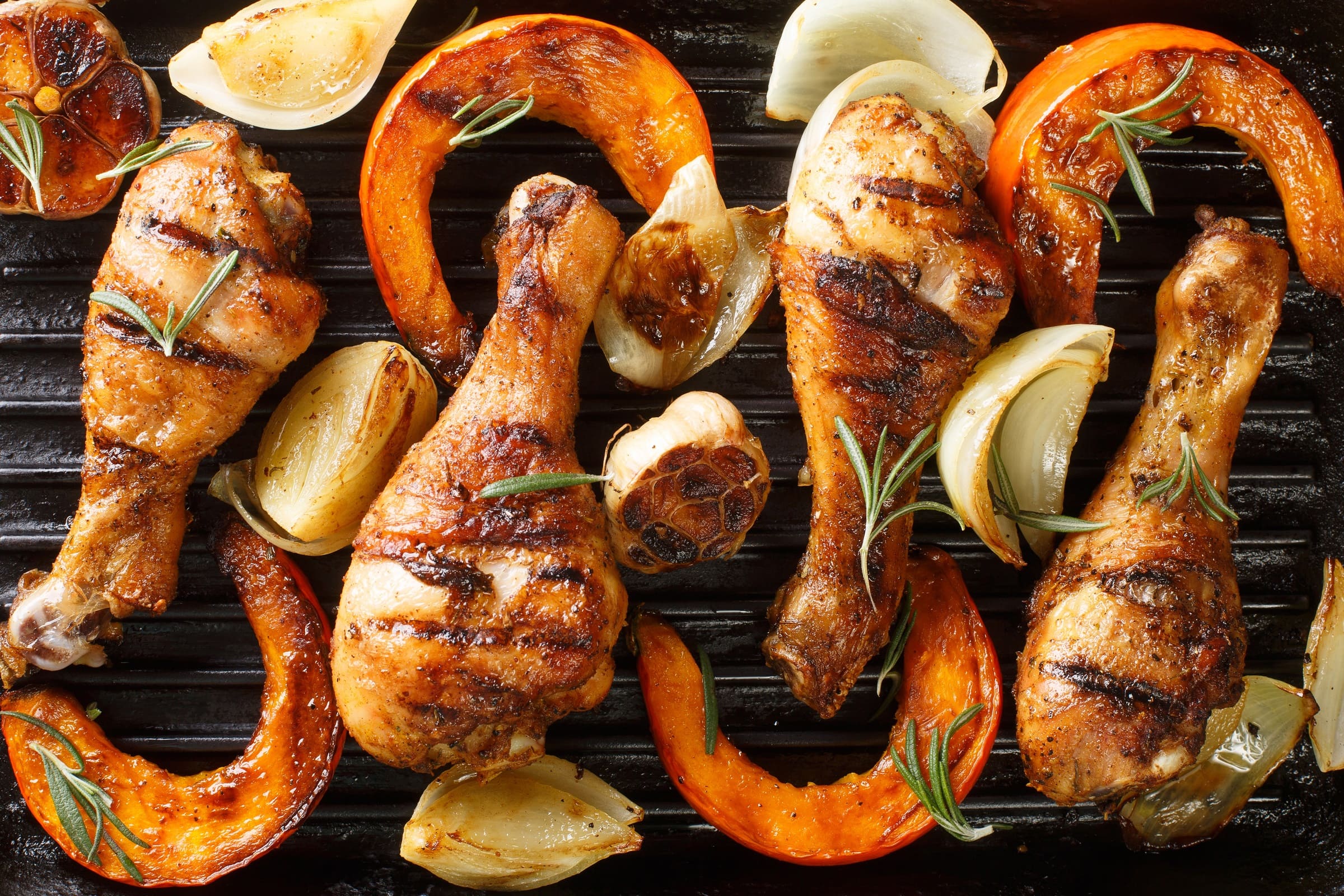 Курка в маринаді карі та солодкий гарбуз — це майже класика осіннього меню. Приготуйте їх разом: м’ясо насититься ароматом овоча, а гарбуз вбере в себе пряний сік гомілок. Просто викладіть гомілки разом з шматочками гарбуза й запікайте разом у духовці близько 30 хвилин при 180 °C.