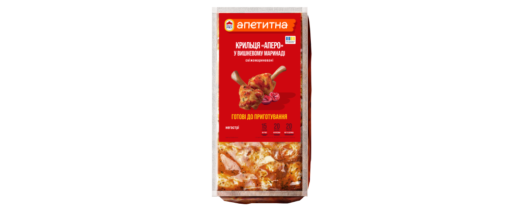 Крильця «Аперо» – це найм’ясистіша частина свіжих крилець «Наша Ряба» у фруктово-пряному маринаді. Нотки вишні та спецій вдало підкреслюють найсмачнішу частину крила – плече, і перетворюють його на ідеальну закуску.