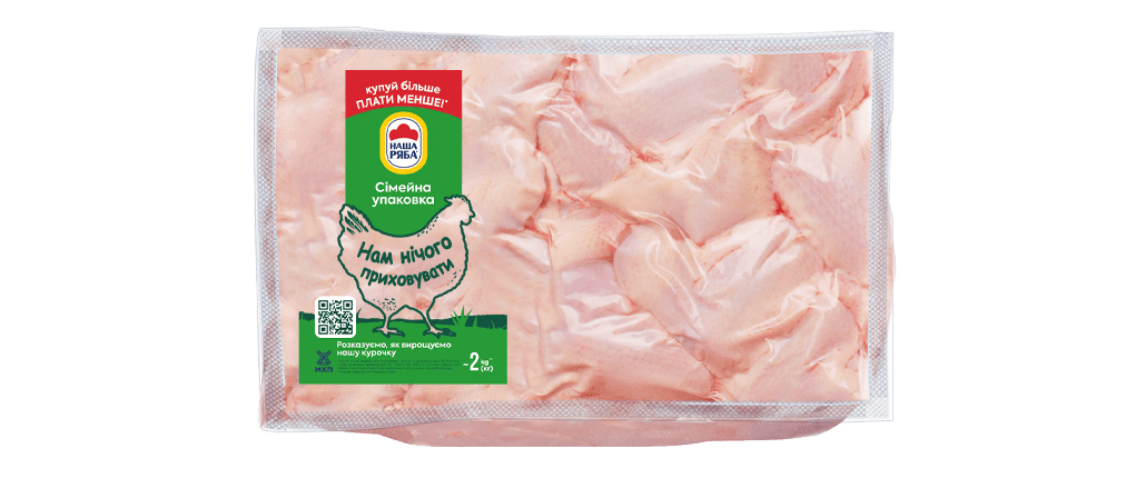 Сімейна упаковка – це 2 кг крила (плечова частина) в якій найбільше м’яса. Продукт зручний в приготуванні, адже не вимагає попередньої обробки.