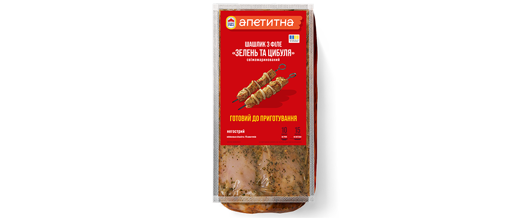 Шашлик зі свіжого філе курочки «Наша Ряба» в класичному поєднанні зелені та цибулі складе вам ідеальну компанію для відпочинку на природі!