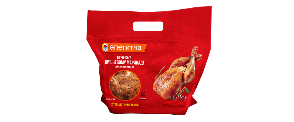 Курочка у вишневому маринаді навіть звучить дуже апетитно. А на смак – це справжня насолода! Соковита, з ледь солодкуватим присмаком, дуже запашна, пряна та ніжна. Вона стане окрасою святкового столу. І зовсім необов’язково витрачати свій час на маринування курки, адже у «Наша Ряба Апетитна» вже є готова до приготування Курочка у вишневому маринаді.