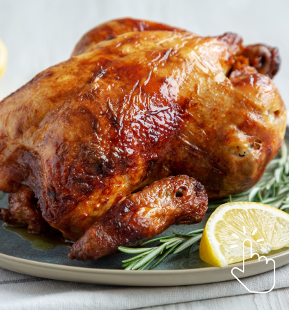 Курочка вже у рукаві для запікання, тому просто покладіть в духовку на 180°C. Щоб отримати рум’яну, хрустку скоринку: за 10–15 хвилин до повної готовності обережно надріжте рукав зверху – завдяки цьому курочка підрум’яниться і матиме красиву, апетитну золотисту скоринку.