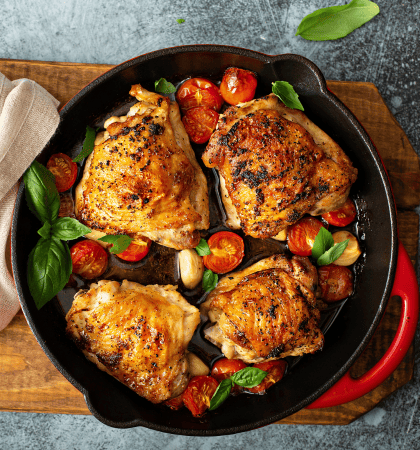 Ідея: приготуйте стегна зі свіжими томатами, базиліком та часником. За бажанням додати пасту пенне — просто та смачно.